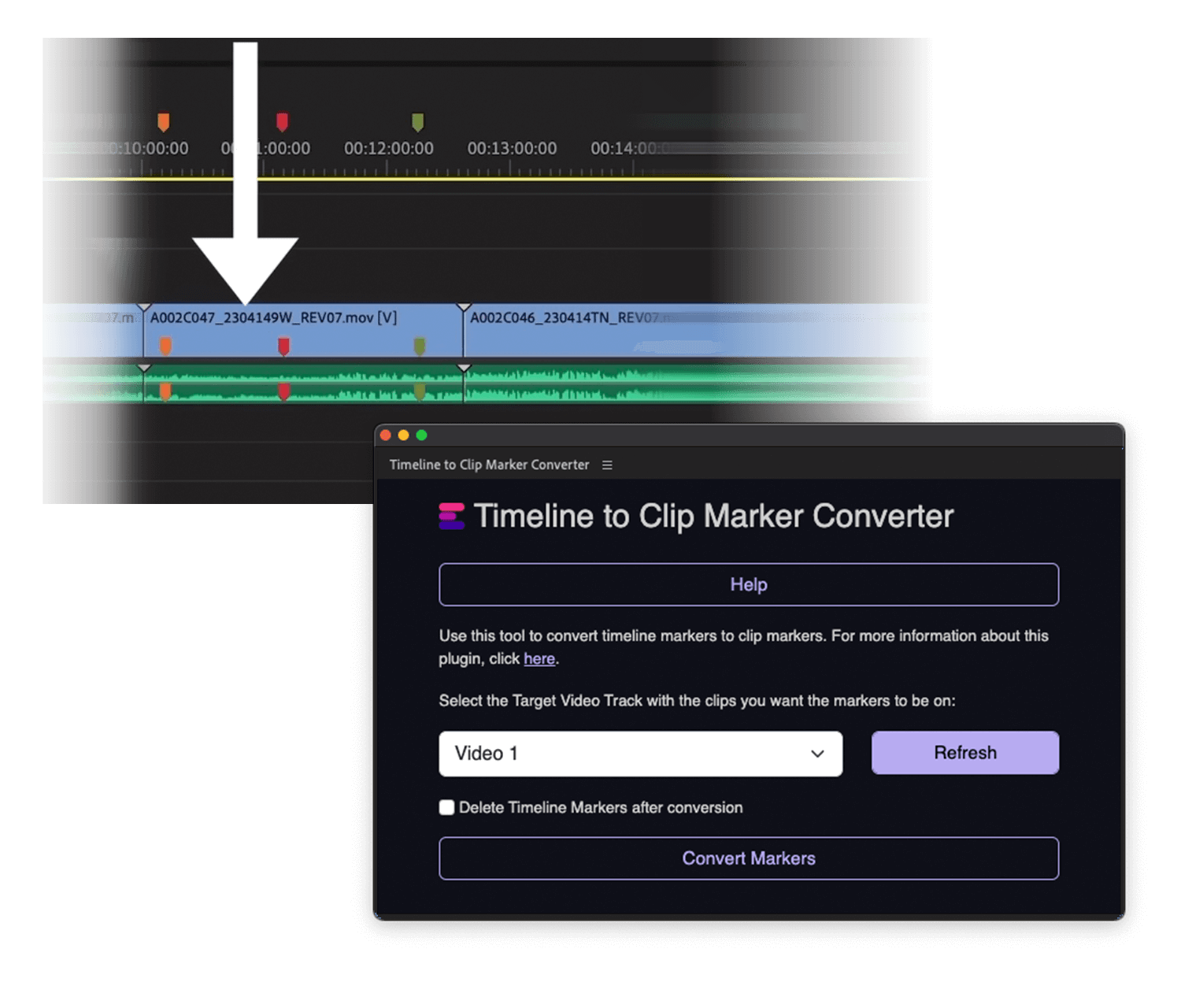 Con este plugin puedes convertir fácilmente todos los marcadores de la línea de tiempo en marcadores de clip. También puedes seleccionar la capa de vídeo donde colocarlos y eliminar los marcadores de línea de tiempo automáticamente tras la conversión. Utiliza este plugin para colocar todos los marcadores de línea de tiempo en clips de vídeo.